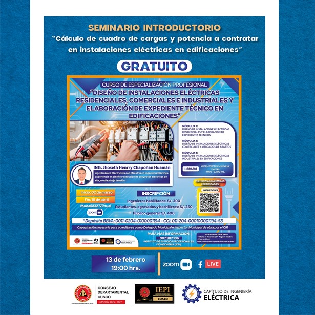El Colegio de Ingenieros del Perú – Consejo Departamental Cusco, a través del Capítulo de Ingeniería Eléctrica y el IEPI, invita al seminario gratuito del curso de especialización: 𝗗𝗜𝗦𝗘Ñ𝗢 𝗗𝗘 𝗜𝗡𝗦𝗧𝗔𝗟𝗔𝗖𝗜𝗢𝗡𝗘𝗦 𝗘𝗟É𝗖𝗧𝗥𝗜𝗖𝗔𝗦 𝗥𝗘𝗦𝗜𝗗𝗘𝗡𝗖𝗜𝗔𝗟𝗘𝗦, 𝗖𝗢𝗠𝗘𝗥𝗖𝗜𝗔𝗟𝗘𝗦 𝗘 𝗜𝗡𝗗𝗨𝗦𝗧𝗥𝗜𝗔𝗟𝗘𝗦 𝗬 𝗘𝗟𝗔𝗕𝗢𝗥𝗔𝗖𝗜Ó𝗡 𝗗𝗘 𝗘𝗫𝗣𝗘𝗗𝗜𝗘𝗡𝗧𝗘 𝗧É𝗖𝗡𝗜𝗖𝗢 𝗘𝗡 𝗘𝗗𝗜𝗙𝗜𝗖𝗔𝗖𝗜𝗢𝗡𝗘𝗦![]()