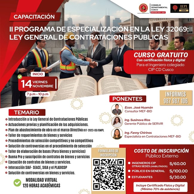 En reconocimiento a la labor, compromiso y aporte de nuestros colegiados, y con motivo de fin de año, el Colegio de Ingenieros del Perú – Consejo Departamental Cusco presenta el II Programa de Especialización en la Ley 32069, totalmente gratuito para nuestros colegiados del CIP Cusco, reafirmando nuestro compromiso de celebrar las fechas especiales con espacios de actualización profesional y crecimiento académico.