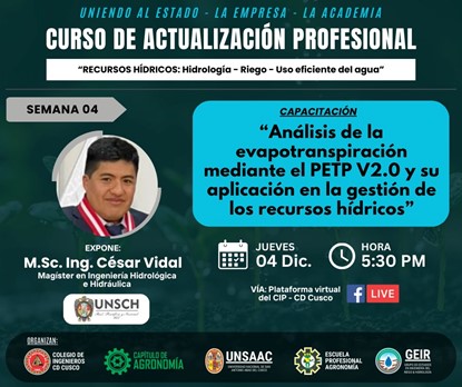 ✅ El Capítulo de Ingeniería Agronómica del CIP Cusco, en el marco del 8° aniversario del GEIR 2025, te invita a participar en este importante curso que reunirá a destacados especialistas de reconocidas instituciones nacionales e internacionales.
