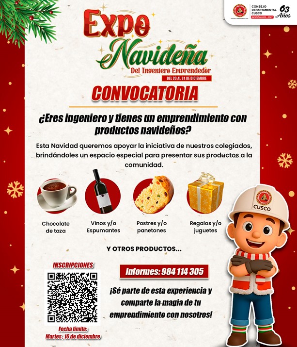 ✅ El CIP – C.D. Cusco invita a todos nuestros colegiados que cuentan con emprendimientos de productos navideños a participar en la Expo Navideña del Ingeniero Emprendedor 2025.