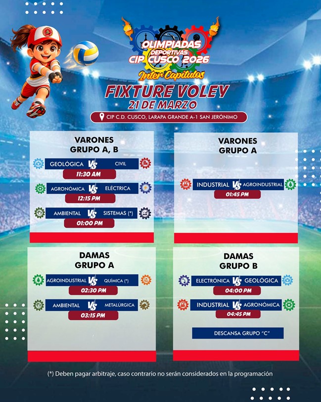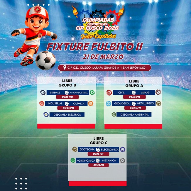✅ Presentamos el fixture de la 3ra fecha de las Olimpiadas Deportivas CIP Cusco - Intercapítulos 2026, un espacio en el que nuestros ingenieros demostrarán su destreza y pasión por el deporte, competirán con pasión, respeto y compañerismo como parte de una misma familia profesional.