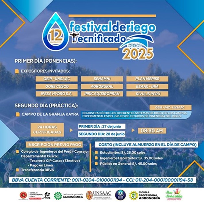 ✅ En el marco de la promoción del uso eficiente del agua y el desarrollo sostenible del sector agrario, se realizará el 12.° Festival de Riego Tecnificado Cusco 2025, los días 27 y 28 de junio, en modalidad presencial.