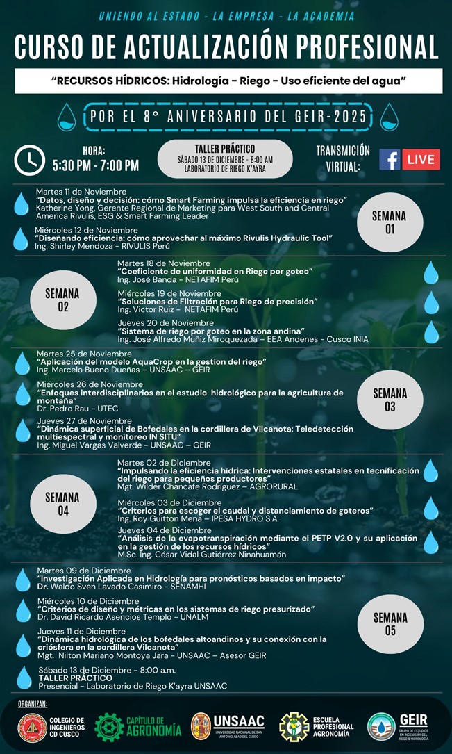 El Capítulo de Ingeniería Agronómica del CIP Cusco, en el marco del 8° aniversario del GEIR 2025, te invita a participar en este importante curso que reunirá a destacados especialistas de reconocidas instituciones nacionales e internacionales.