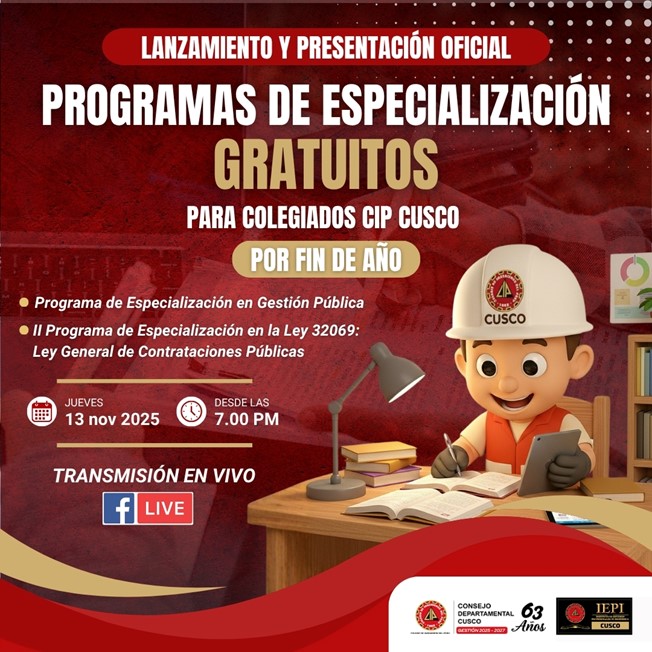 En reconocimiento a la labor, compromiso y aporte de nuestros colegiados, y con motivo de fin de año, el Colegio de Ingenieros del Perú – Consejo Departamental Cusco realizará el lanzamiento y presentación oficial de los Programas de Especialización Gratuitos, dirigidos a todos nuestros ingenieros colegiados del CIP CD Cusco.
