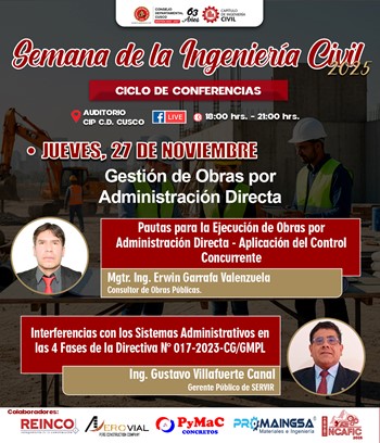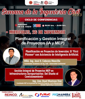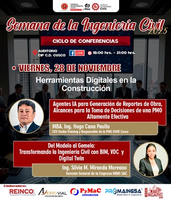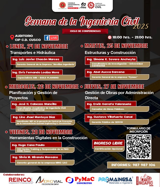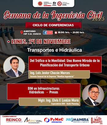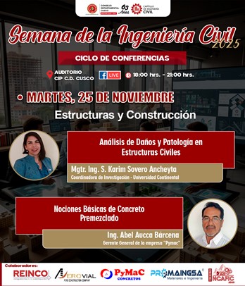 ✅ El Capítulo de Ingeniería Civil del CIP C.D. Cusco invita a participar del Ciclo de Conferencias por la Semana de la Ingeniería Civil 2025, un espacio de actualización y fortalecimiento profesional.