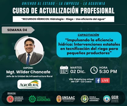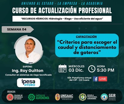 ✅ El Capítulo de Ingeniería Agronómica del CIP Cusco, en el marco del 8° aniversario del GEIR 2025, te invita a participar en este importante curso que reunirá a destacados especialistas de reconocidas instituciones nacionales e internacionales.