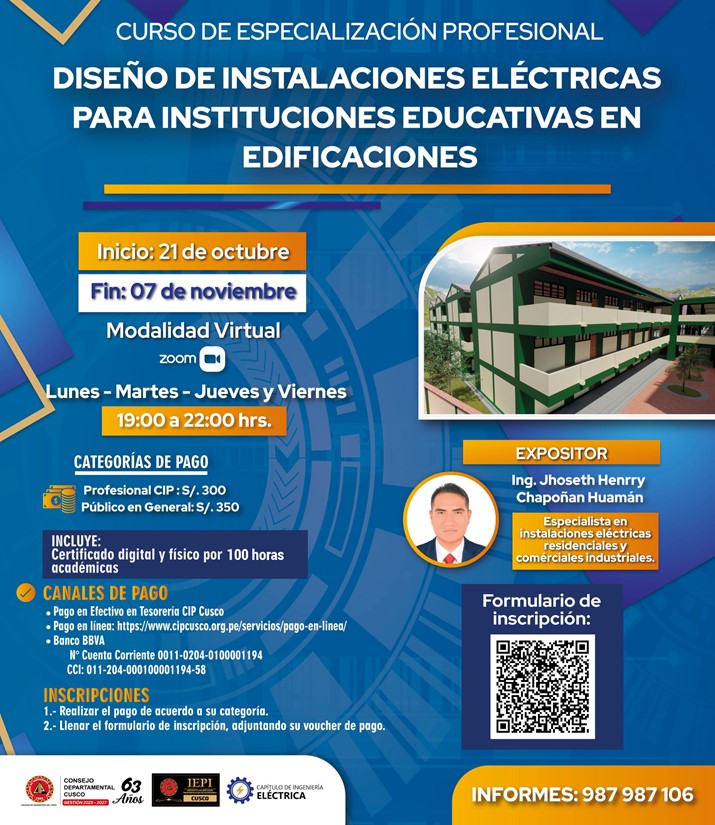 El Colegio de Ingenieros del Perú – Consejo Departamental Cusco, a través del Capítulo de Ingeniería Eléctrica, invita a participar en este curso especializado que fortalecerá tus competencias en el diseño de instalaciones eléctricas.