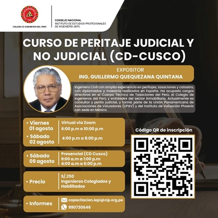 El Colegio de Ingenieros del Perú, a través del Instituto de Estudios Profesionales de Ingeniería (IEPI), organiza el Curso Nacional de Peritaje Judicial y No Judicial, dirigido a todos los ingenieros colegiados y habilitados que deseen fortalecer sus competencias técnicas en este campo. El Consejo Departamental Cusco promueve esta importante actividad formativa, que contará con sesiones virtuales y presenciales. 𝗘𝗫𝗣𝗢𝗦𝗜𝗧𝗢𝗥: