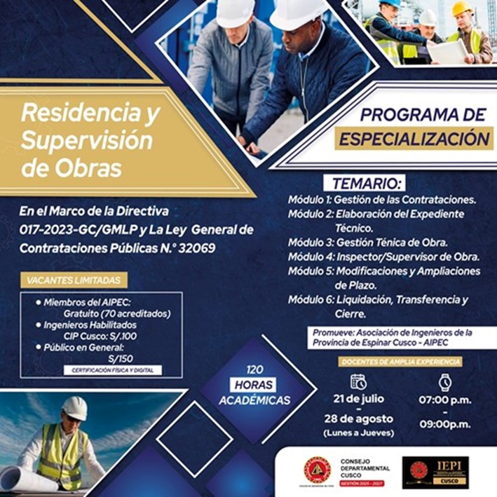 En el marco de la Directiva 017-2023-GC/GMLP y la Ley General de Contrataciones Públicas N.° 32069, el Colegio de Ingenieros del Perú – Consejo Departamental Cusco, a través del IEPI, en coordinación con la Asociación de Ingenieros de la Provincia de Espinar (AIPEC), lanza el Programa de Especialización en Residencia y Supervisión de Obras, dirigido a fortalecer competencias técnicas y normativas en ejecución de obras públicas.