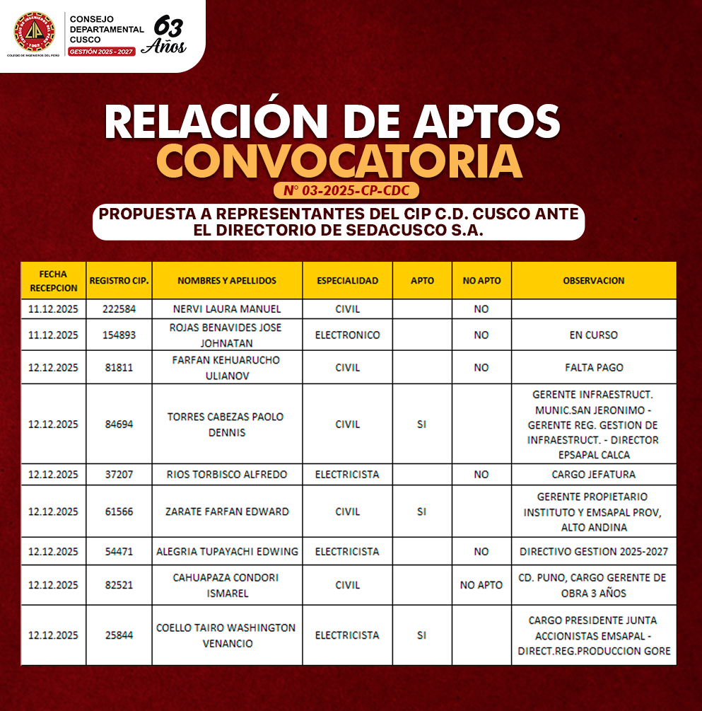✅ La Comisión a cargo del proceso de la convocatoria del Colegio de Ingenieros del Perú – Consejo Departamental Cusco comunica la relación de aptos de este Concurso de Méritos para la presentación de propuestas de candidatos que integrarán el Directorio de la EPS SEDACUSCO SA, mismos que ya fueron subidos a la plataforma digital.