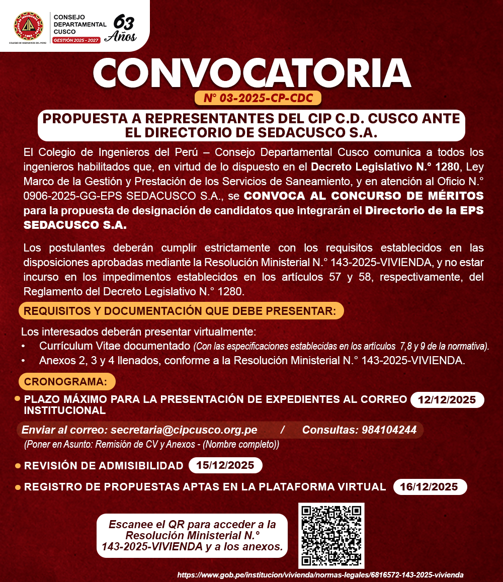 ✅ El Colegio de Ingenieros del Perú – Consejo Departamental Cusco comunica a todos los ingenieros habilitados que, conforme al Decreto Legislativo N.º 1280 y en atención al Oficio N.º 0906-2025-GG-EPS SEDACUSCO SA, se convoca al Concurso de Méritos para la presentación de propuestas de candidatos que integrarán el Directorio de la EPS SEDACUSCO SA