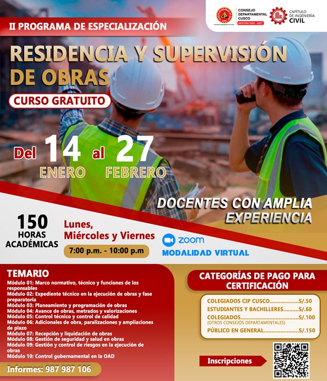 El Capítulo de Ingeniería Civil del CIP C.D. Cusco, invita al programa de especialización virtual con 150 horas académicas y docentes de amplia experiencia.