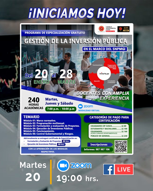 El Colegio de Ingenieros del Perú – Consejo Departamental Cusco, a través de IEPI, da inicio a este importante programa de especialización orientado a fortalecer las competencias en la Gestión de la Inversión Pública, en el marco del SNPMGI.