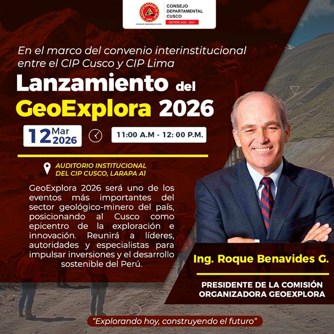 En el marco del convenio interinstitucional entre el Colegio de Ingenieros del Perú – Consejo Departamental Cusco y el CIP Lima, este 12 de marzo realizaremos el Lanzamiento Oficial de GeoExplora 2026, uno de los encuentros más importantes del sector geológico-minero del país.