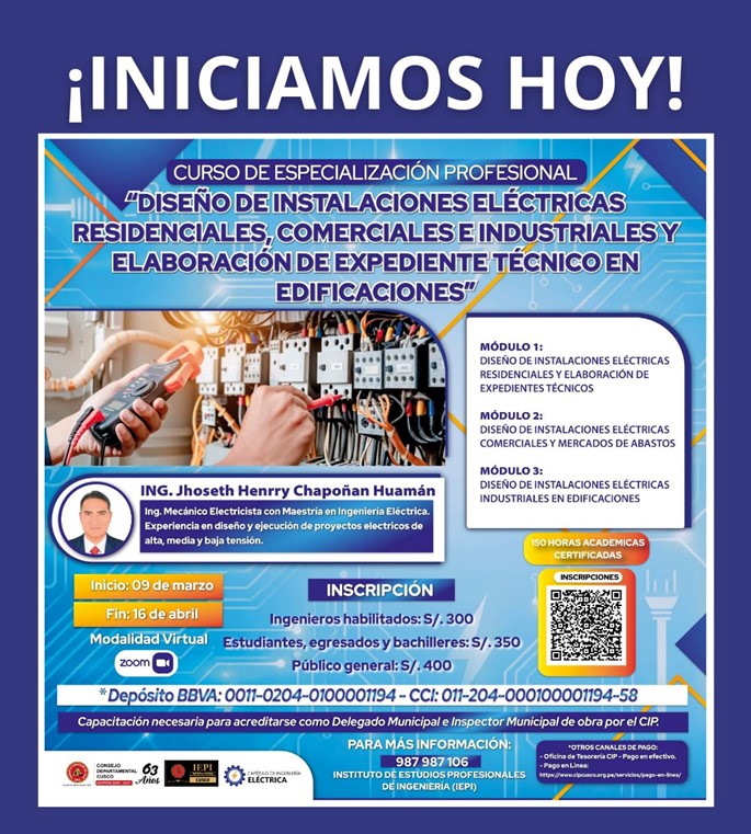 El Capítulo de Ingeniería Eléctrica del Colegio de Ingenieros del Perú - C.D. Cusco, a través del IEPI, invita a este importante curso de especialización profesional.