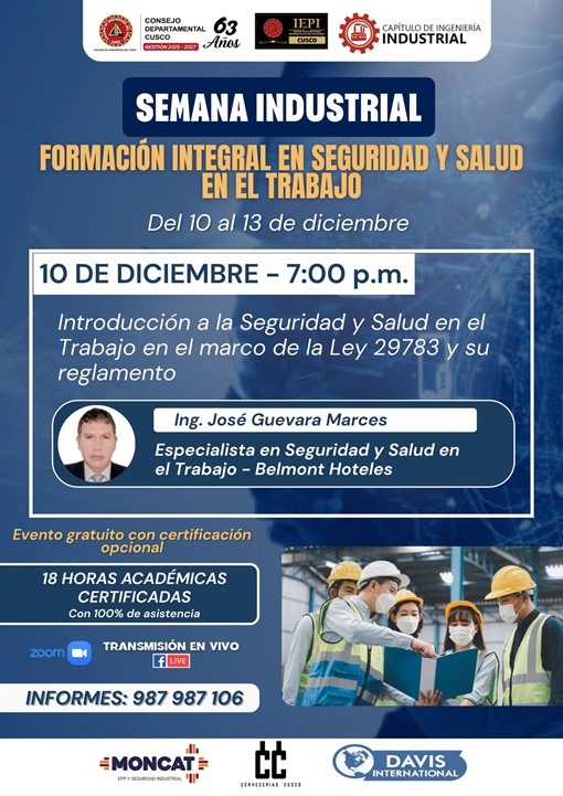 ✅ El Capítulo de Ingeniería Industrial del Colegio de Ingenieros del Perú – Consejo Departamental Cusco, en el marco de su aniversario institucional, invita a nuestros colegiados, profesionales y estudiantes al ciclo de capacitaciones que se desarrollará del 10 al 13 de diciembre, fortaleciendo las competencias técnicas en temas de seguridad, prevención y gestión operativa.