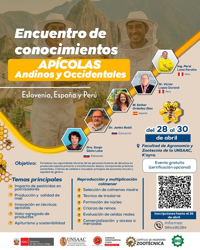 El Colegio de Ingenieros del Perú – Consejo Departamental Cusco, a través del Capítulo de Ingeniería Zootécnica, invita a participar en el Encuentro de Conocimientos Apícolas Andinos y Occidentales, un espacio de intercambio técnico y académico con especialistas de Eslovenia, España y Perú.