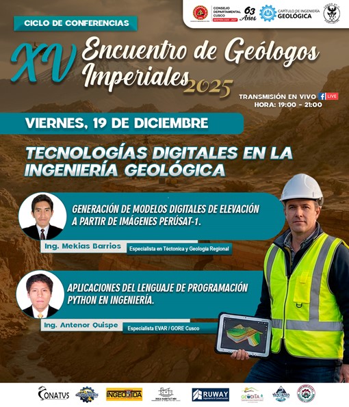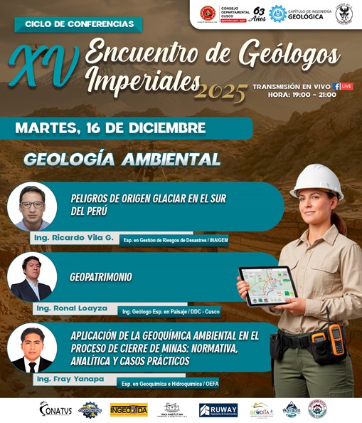 ✅ El Capítulo de Ingeniería Geológica del Colegio de Ingenieros del Perú – C.D. Cusco, junto al Código 07-II Piroclastos, invitan a profesionales, estudiantes y público interesado a participar del Ciclo de Conferencias del XV Encuentro de Geólogos Imperiales 2025.