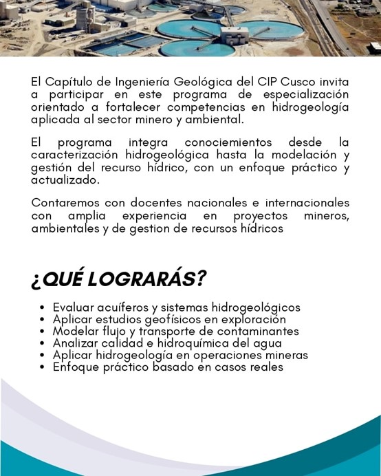 ✅ El Capítulo de Ingeniería Geológica del CIP Cusco, invita a participar en este importante programa de especialización orientado a fortalecer competencias en hidrogeología aplicada al sector minero y ambiental.