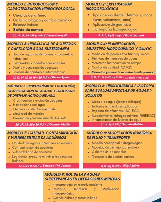 ✅ El programa comprende 9 módulos especializados, abordando desde la caracterización hidrogeológica hasta la modelación de flujo y calidad de aguas subterráneas, con un enfoque práctico y actualizado.