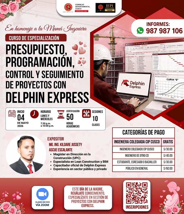 En el marco del día de la madre el CIP Cusco te invita a fortalecer tus competencias profesionales con nuestro curso de especialización en Presupuesto, Programación, Control y Seguimiento de Proyectos con Delphin Express.