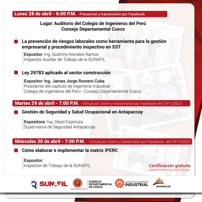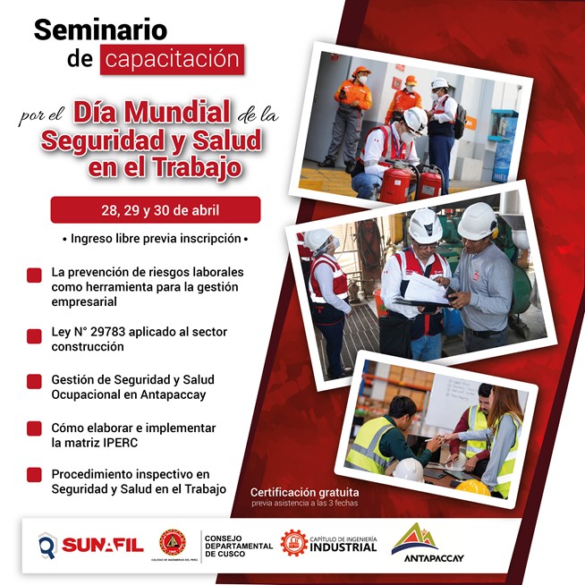 En conmemoración del Día Mundial de la Seguridad y Salud en el Trabajo, el Colegio de Ingenieros del Perú - Consejo Departamental Cusco, a través de su Capítulo de Ingeniería Industrial, en coorganización con SUNAFIL y la empresa Antapaccay, invita a sus colegiados y al público en general a participar en este importante ciclo de ponencias orientado a fortalecer la gestión de la seguridad y salud ocupacional en el ejercicio profesional.
