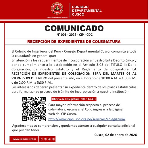 Con esta herramienta, el Colegio de Ingenieros del Perú reafirma su compromiso con la modernización institucional y la mejora continua de la atención a sus futuros colegiados, facilitando un proceso transparente, eficiente y alineado con las necesidades actuales de los profesionales de la ingeniería.