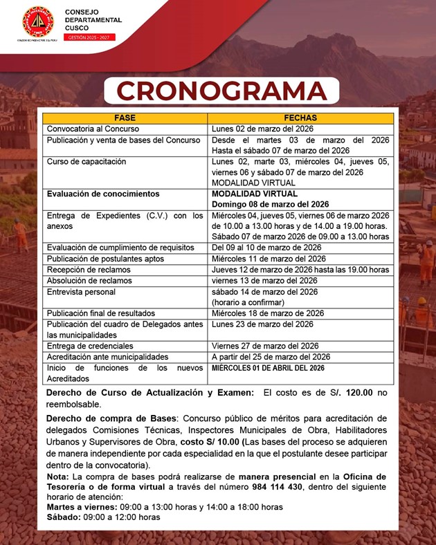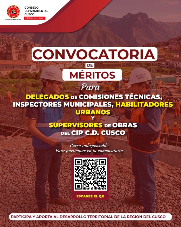✅ El Colegio de Ingenieros del Perú — CD Cusco publica el cronograma oficial del proceso de acreditación de Delegados de Comisiones Técnicas Municipales, Inspectores Municipales, Habilitadores Urbanos y Supervisores Privados de Obra.