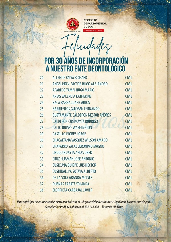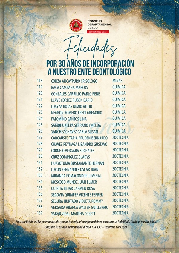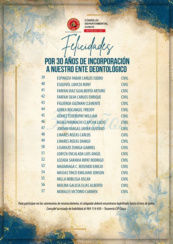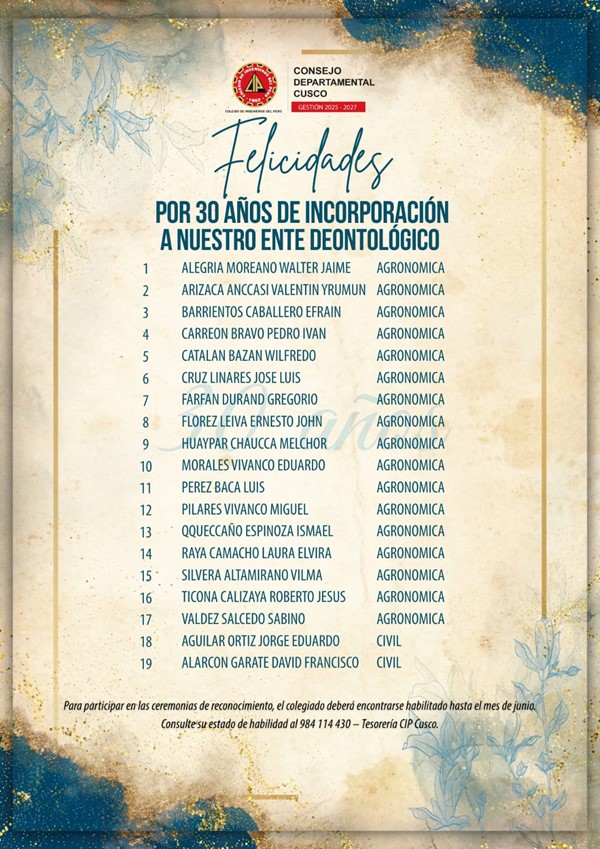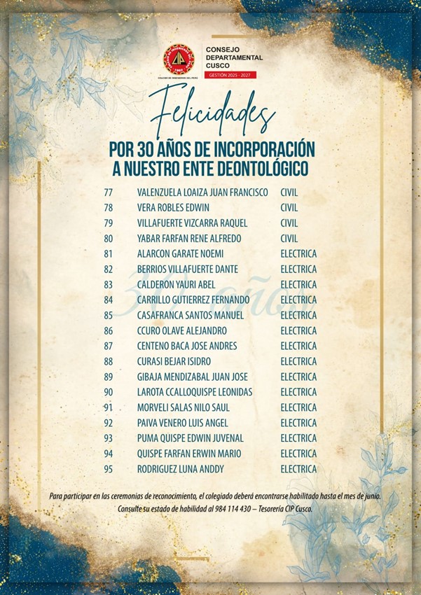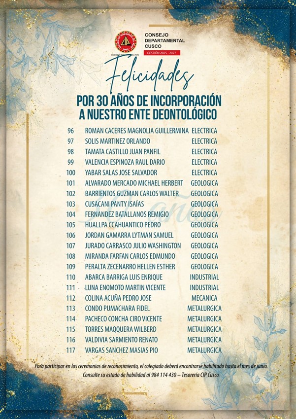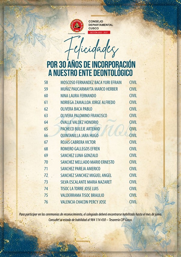 ✅ El Colegio de Ingenieros del Perú – Consejo Departamental Cusco comparte la relación de 139 colegiados que cumplen 30 años de incorporación a nuestra orden profesional, a quienes extendemos un merecido reconocimiento por su destacada trayectoria y valioso aporte al desarrollo de la ingeniería.