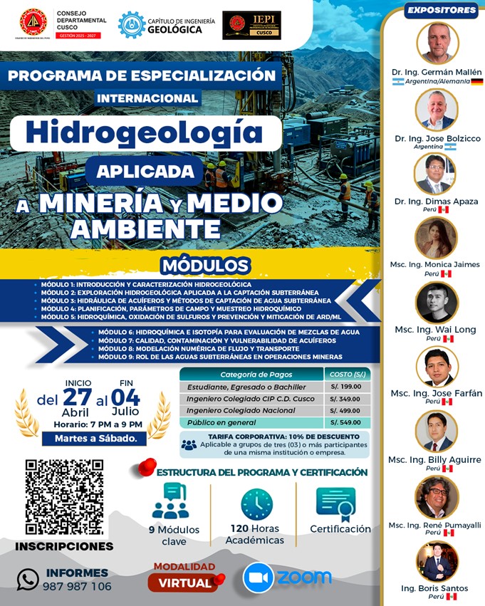 El Capítulo de Ingeniería Geológica del CIP Cusco, invita a participar en este importante programa de especialización orientado a fortalecer competencias en hidrogeología aplicada al sector minero y ambiental.