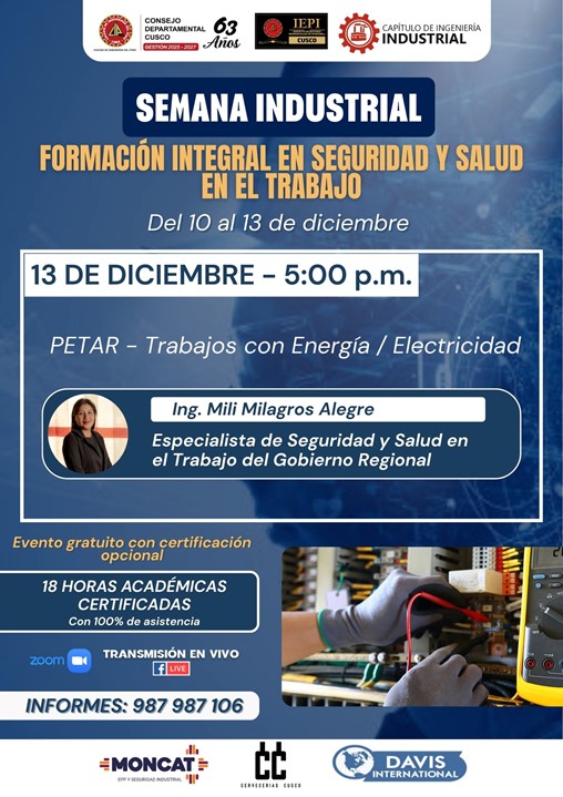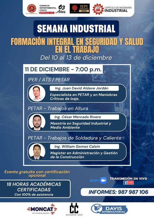 ✅ El Capítulo de Ingeniería Industrial del Colegio de Ingenieros del Perú – Consejo Departamental Cusco, en el marco de su aniversario institucional, invita a nuestros colegiados, profesionales y estudiantes al ciclo de capacitaciones que se desarrollará del 10 al 13 de diciembre, fortaleciendo las competencias técnicas en temas de seguridad, prevención y gestión operativa.