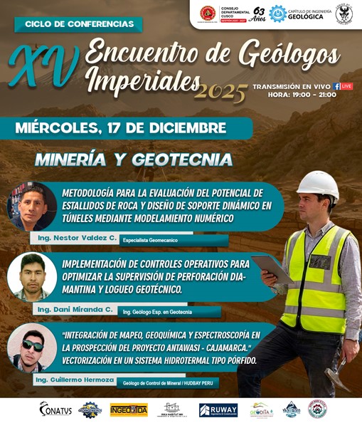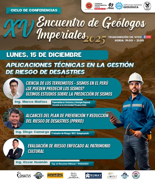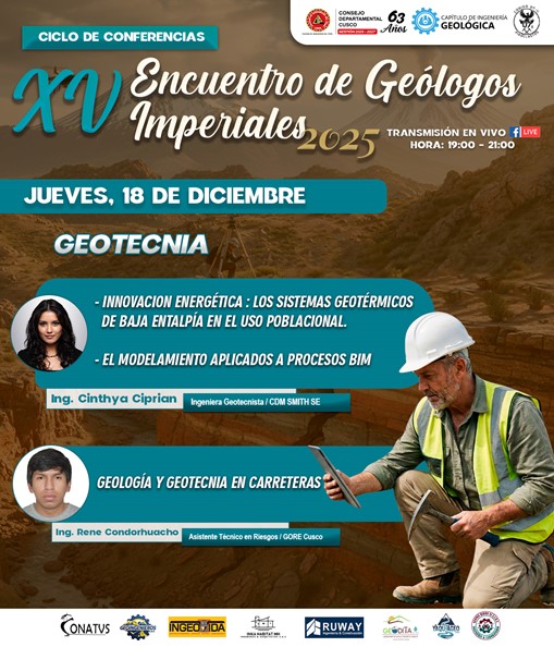 ✅ El Capítulo de Ingeniería Geológica del Colegio de Ingenieros del Perú – C.D. Cusco, junto al Código 07-II Piroclastos, invitan a profesionales, estudiantes y público interesado a participar del Ciclo de Conferencias del XV Encuentro de Geólogos Imperiales 2025.