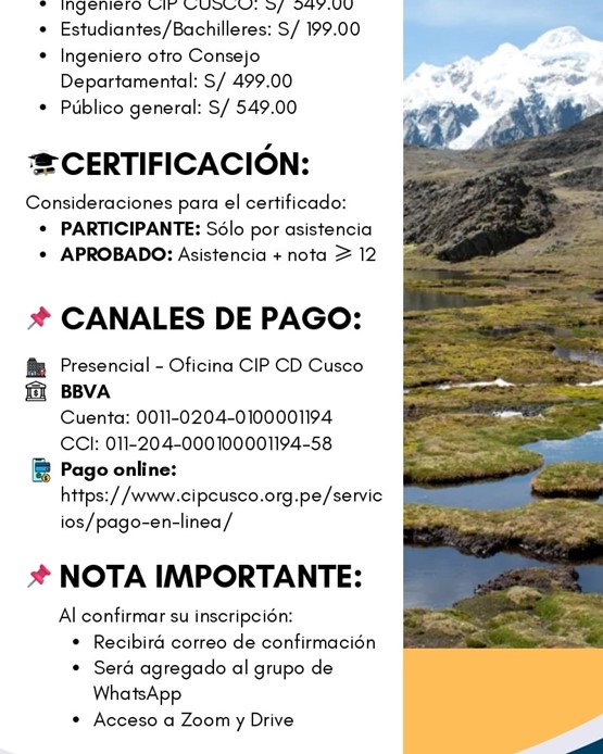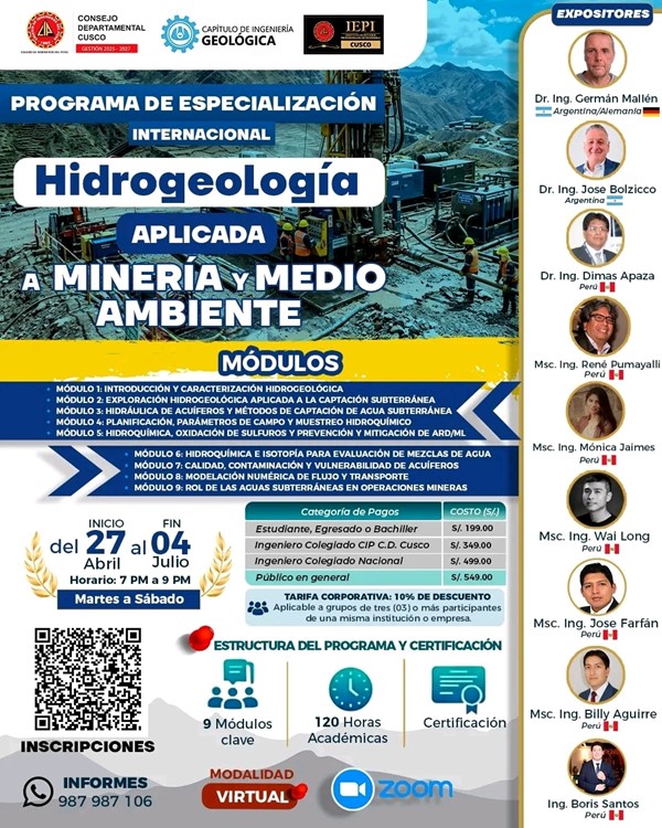✅ El Capítulo de Ingeniería Geológica del CIP Cusco, invita a participar en este importante programa de especialización orientado a fortalecer competencias en hidrogeología aplicada al sector minero y ambiental.