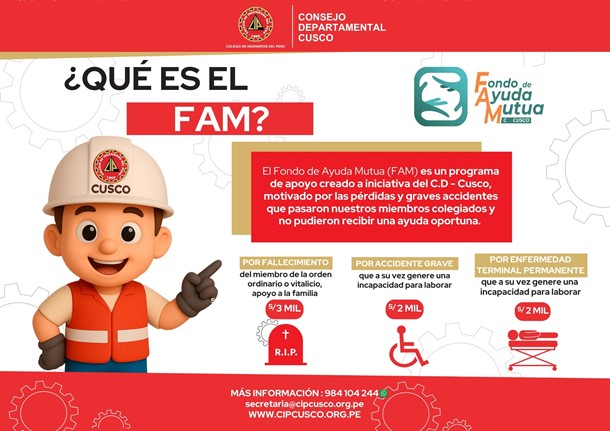 El FAM, son las siglas del FONDO DE AYUDA MUTUA del Consejo Departamental Cusco del Colegio de Ingenieros del Perú (CIP – Cusco), que promueve la solidaridad entre nuestros miembros colegiados.